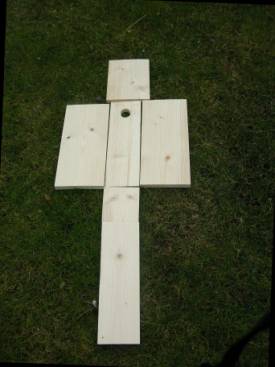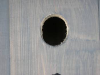 Speciellt för göktyteholken är dels det ovala hålet, 35 x 40 mm, (se bild 3) och dels holkens djup. Framstyckets höjd är 390 mm och bredden 120 mm vilket gör holken långsmal. Vidare ska holken vara så ljustät som möjligt, därför har vi limmat och skruvat ihop holkarna.